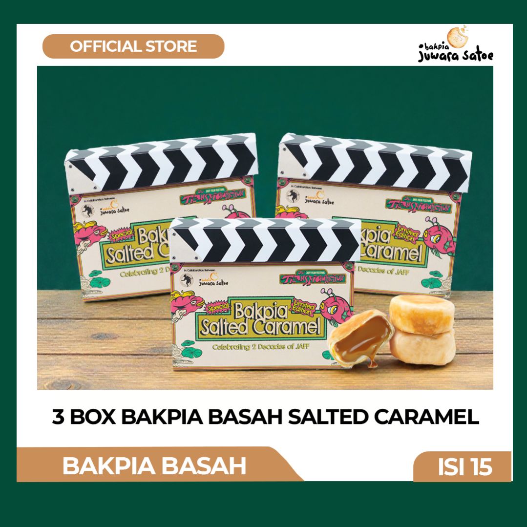[ 3 BOX ] Bakpia Basah Salted Caramel Isi 15 Apa itu Bakpia Salted Caramel? Varian bakpia edisi kolaborasi eksklusif Juwara Satoe x JAFF. Menghadirkan rasa karamel lembut berpadu sentuhan garam laut yang memberikan keseimbangan cita rasa creamy. Ciri Khas Rasa Karamel lembut berpadu hint garam laut yang gurih. Aftertaste buttery, seimbang, dan tidak berlebihan manisnya. Tekstur Lembut dan moist. Jauh lebih creamy dibanding varian bakpia reguler. Unique Selling Proposition - Perpaduan rasa Salted Caramel pada Bakpia Basah. - Packaging eksklusif kolaborasi dengan JAFF ber bentuk cillper film. - Collectible item dengan daya tarik audiens kreatif. Benefit Konsumen - Pengalaman rasa baru yang premium dengan kemasan box yang uniqe - Cocok sebagai buah tangan atau hadiah edisi terbatas.